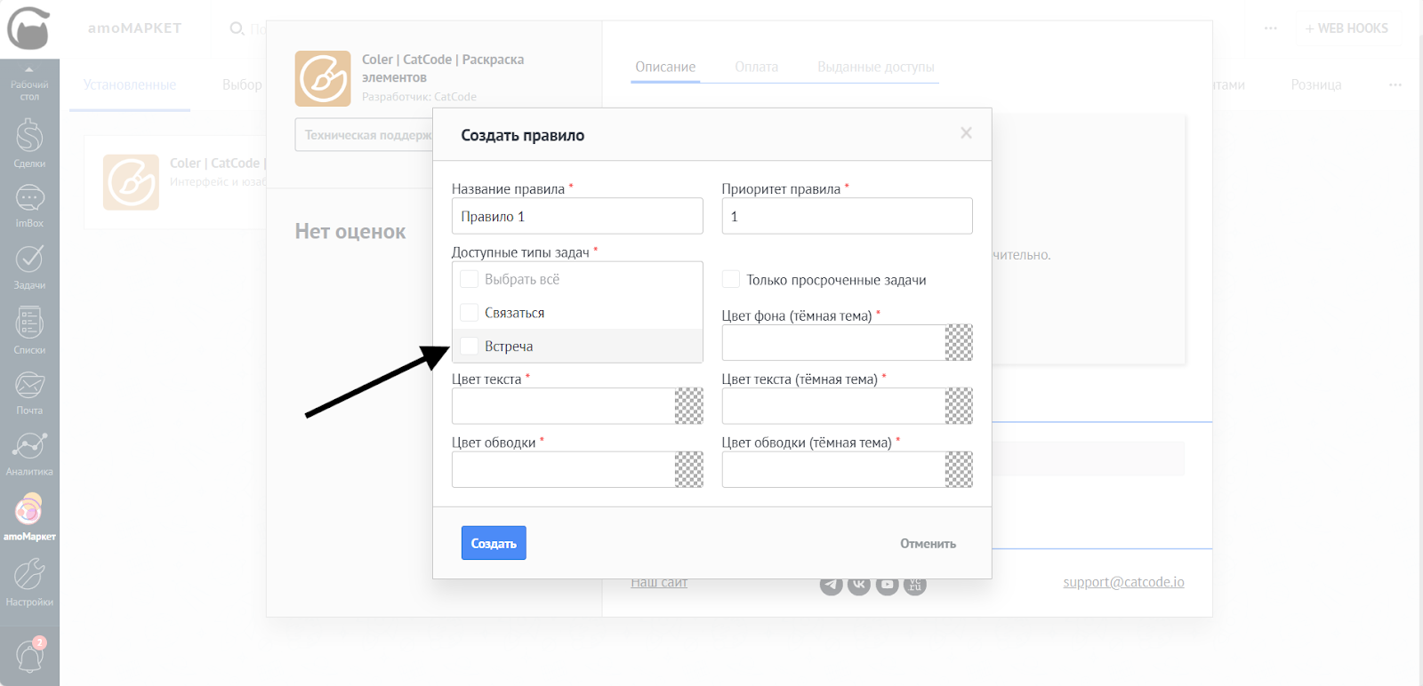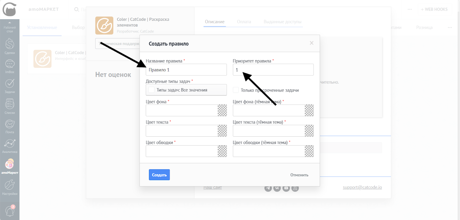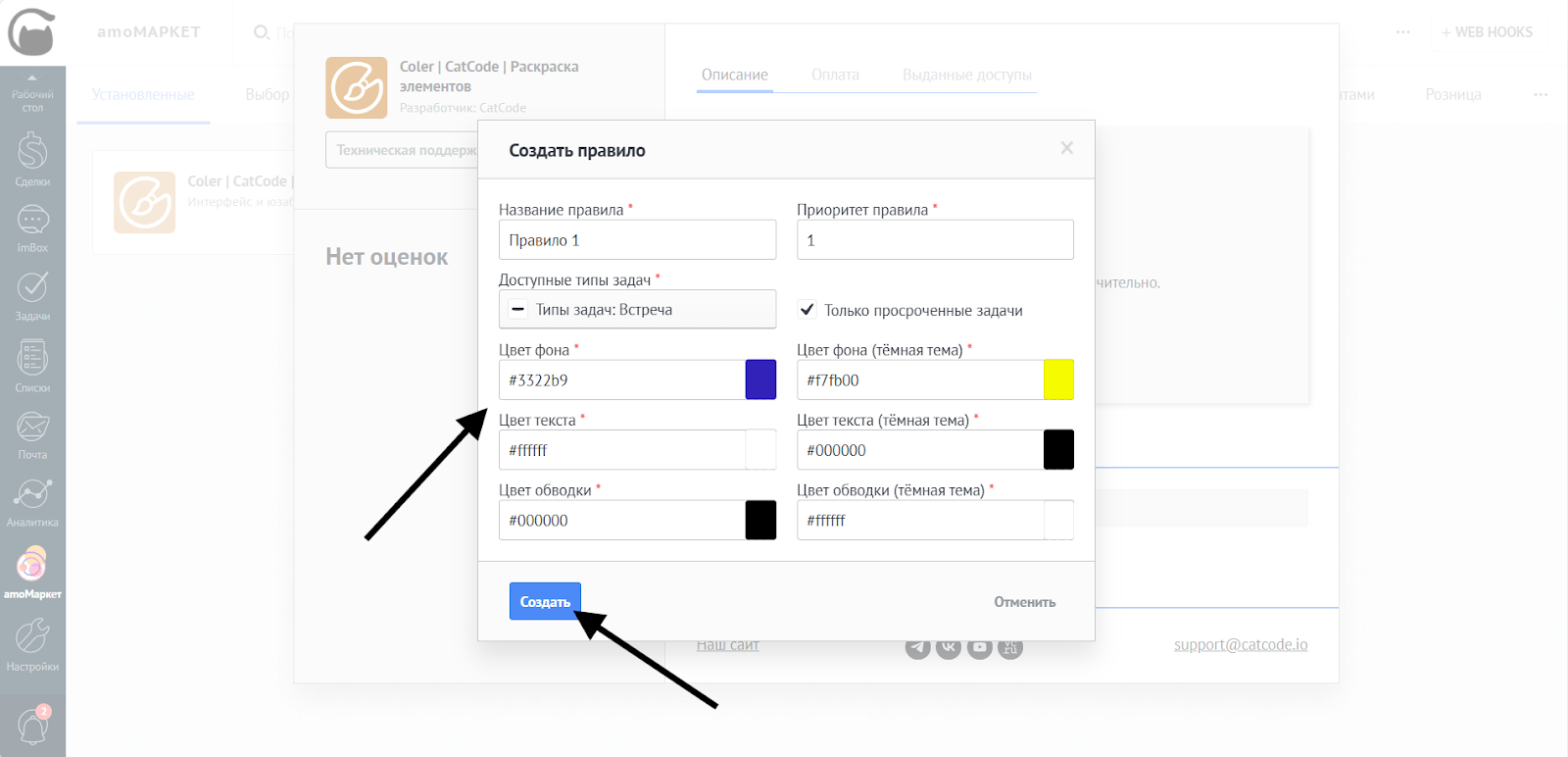 На этом этапе можно настроить цвета отдельно для светлой и тёмной тем amoCRM.