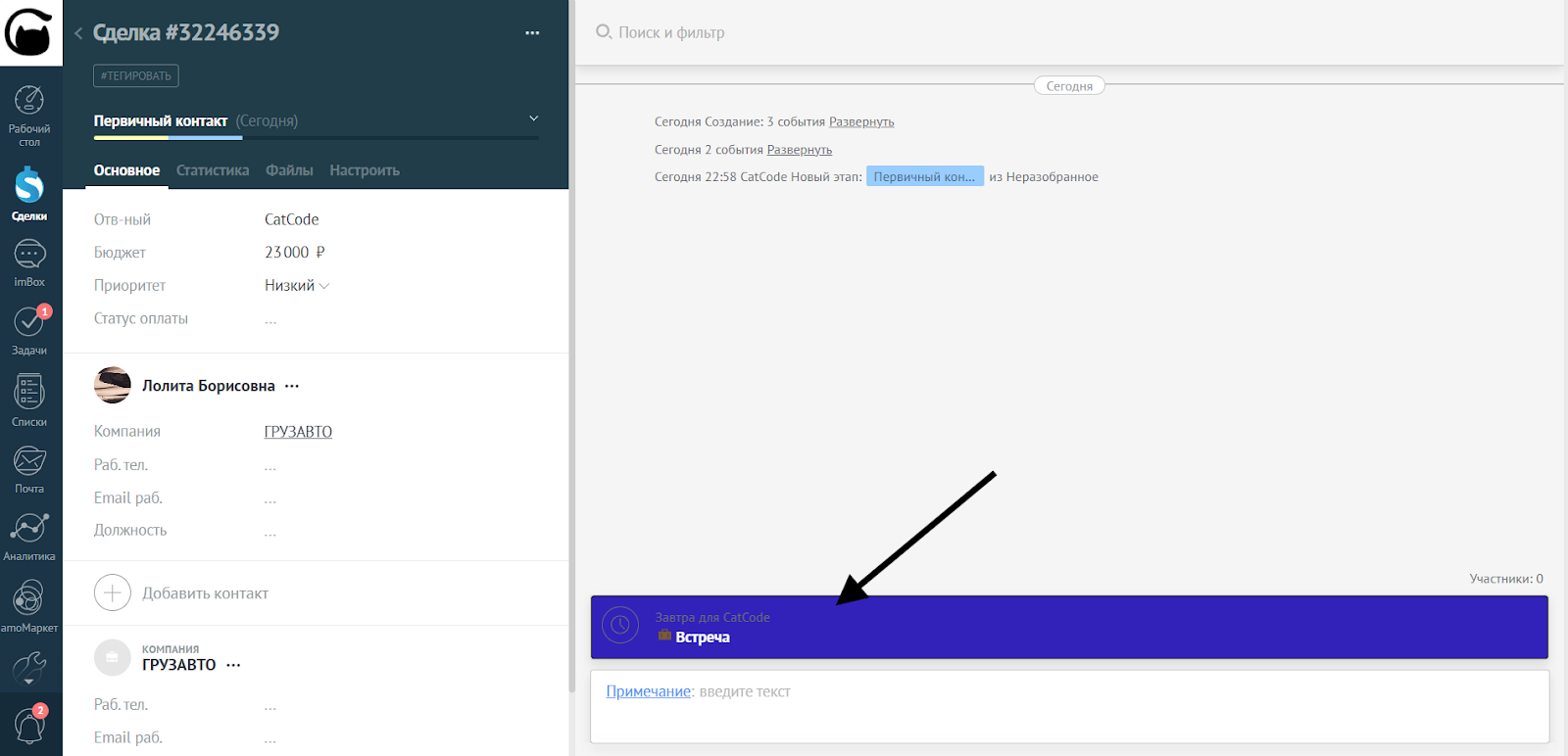 - Выберите тип задачи — например, «Встреча»: