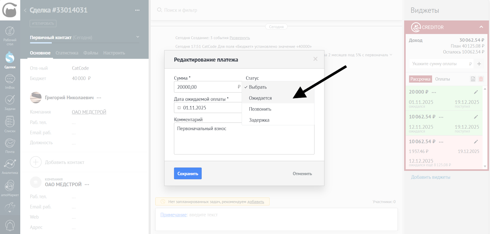 - Можете изменить статус платежа, выбрав нужный из выпадающего списка: