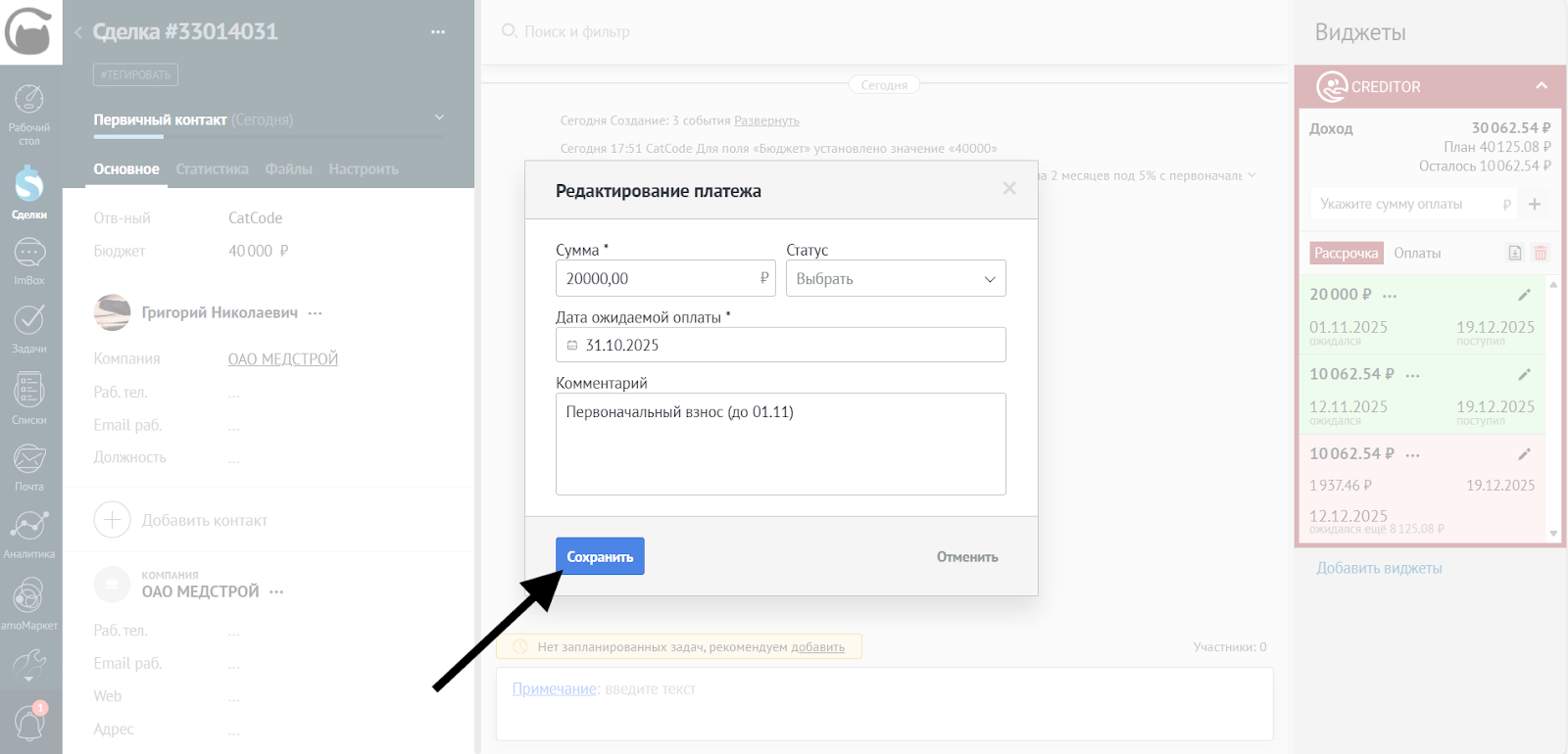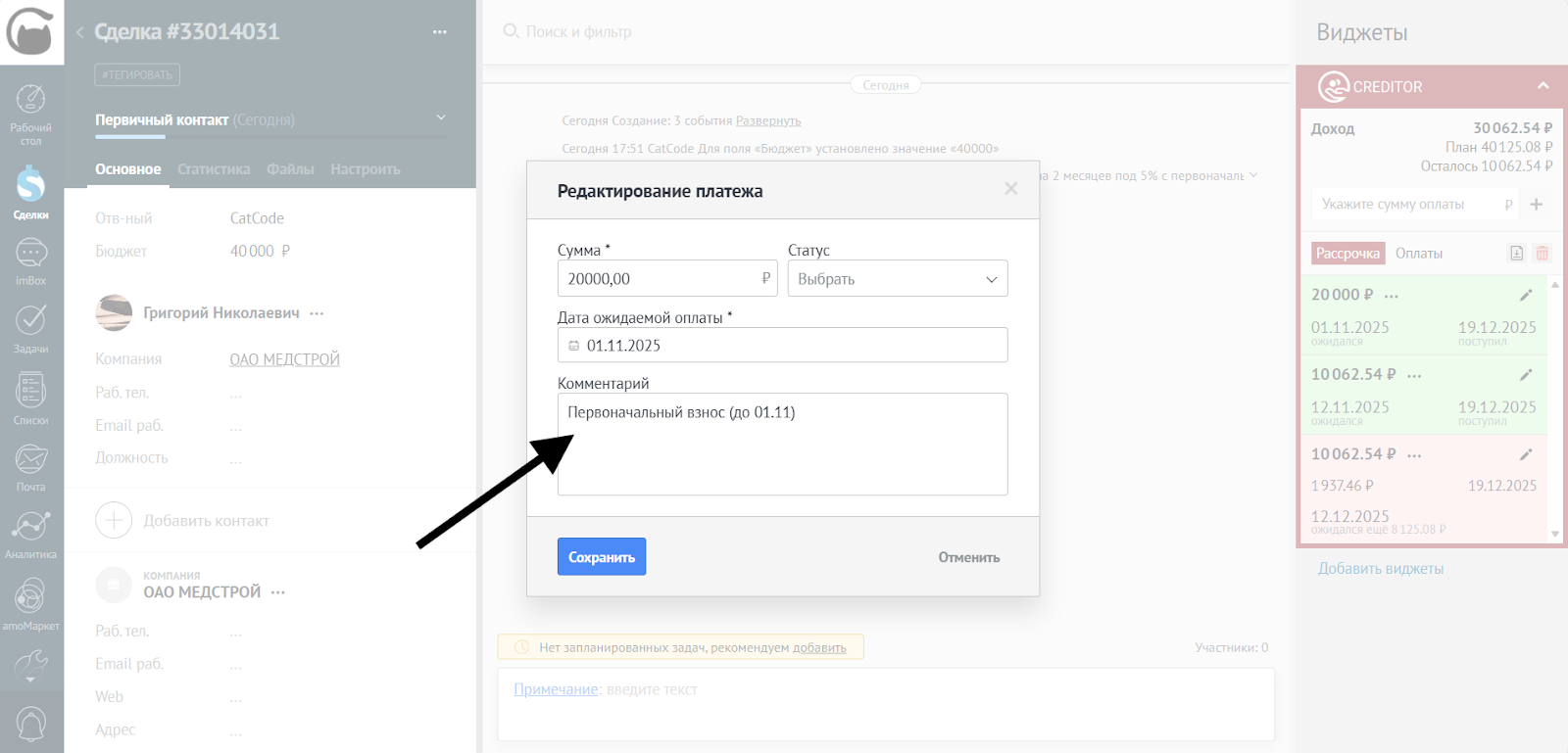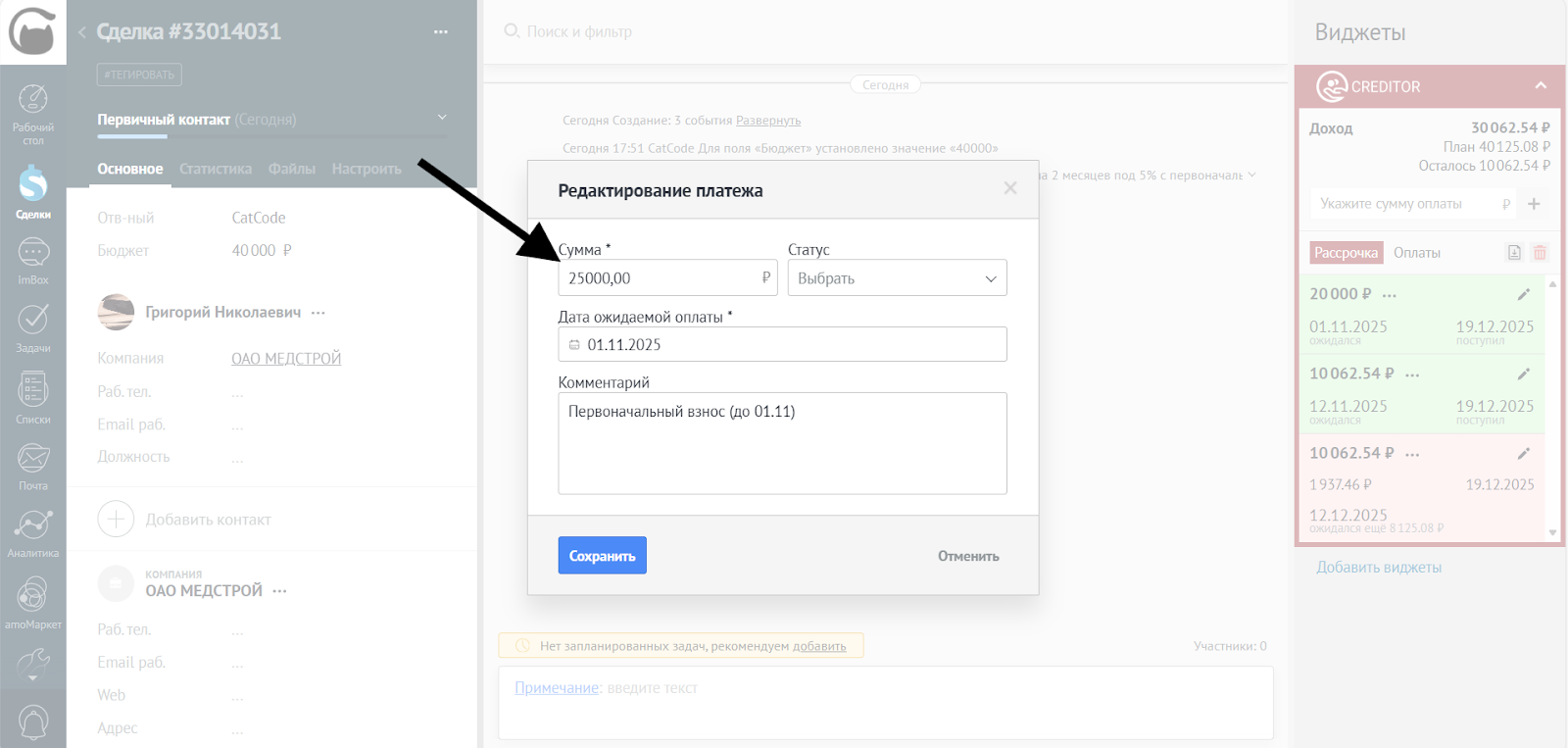 - Отредактировать сумму платежа: