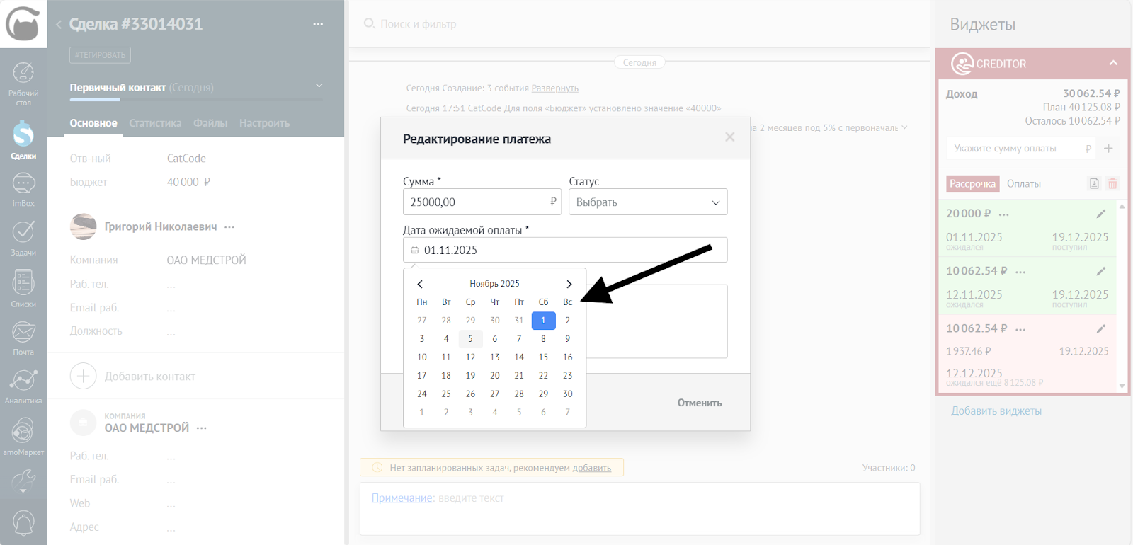 - Платежи в рассрочке можно отредактировать, кликнув на иконку карандаша рядом с нужным платежом: