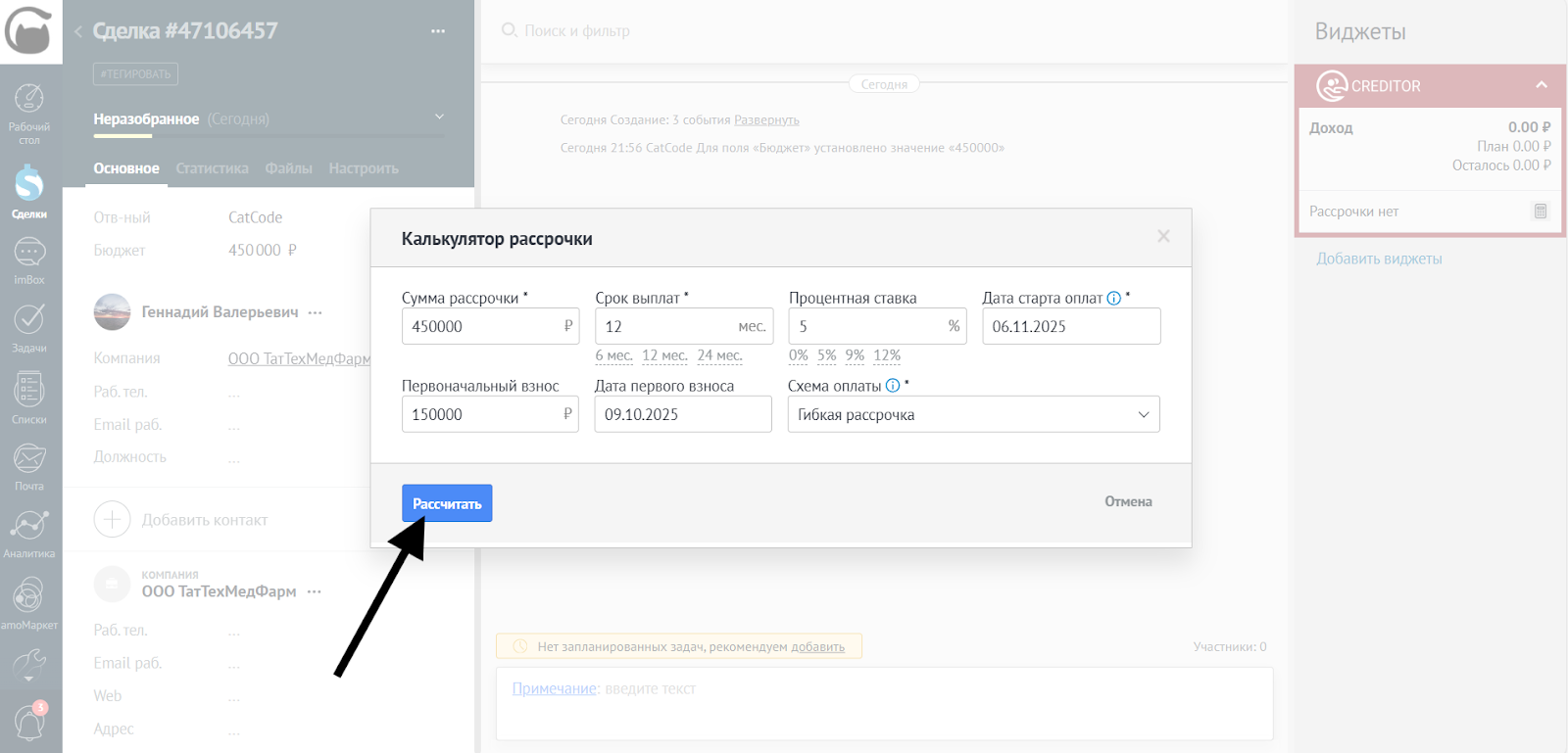 - При добавлении рассрочки выберите схему Гибкая рассрочка. Кликните Рассчитать, чтобы сформировать платежи по умолчанию: