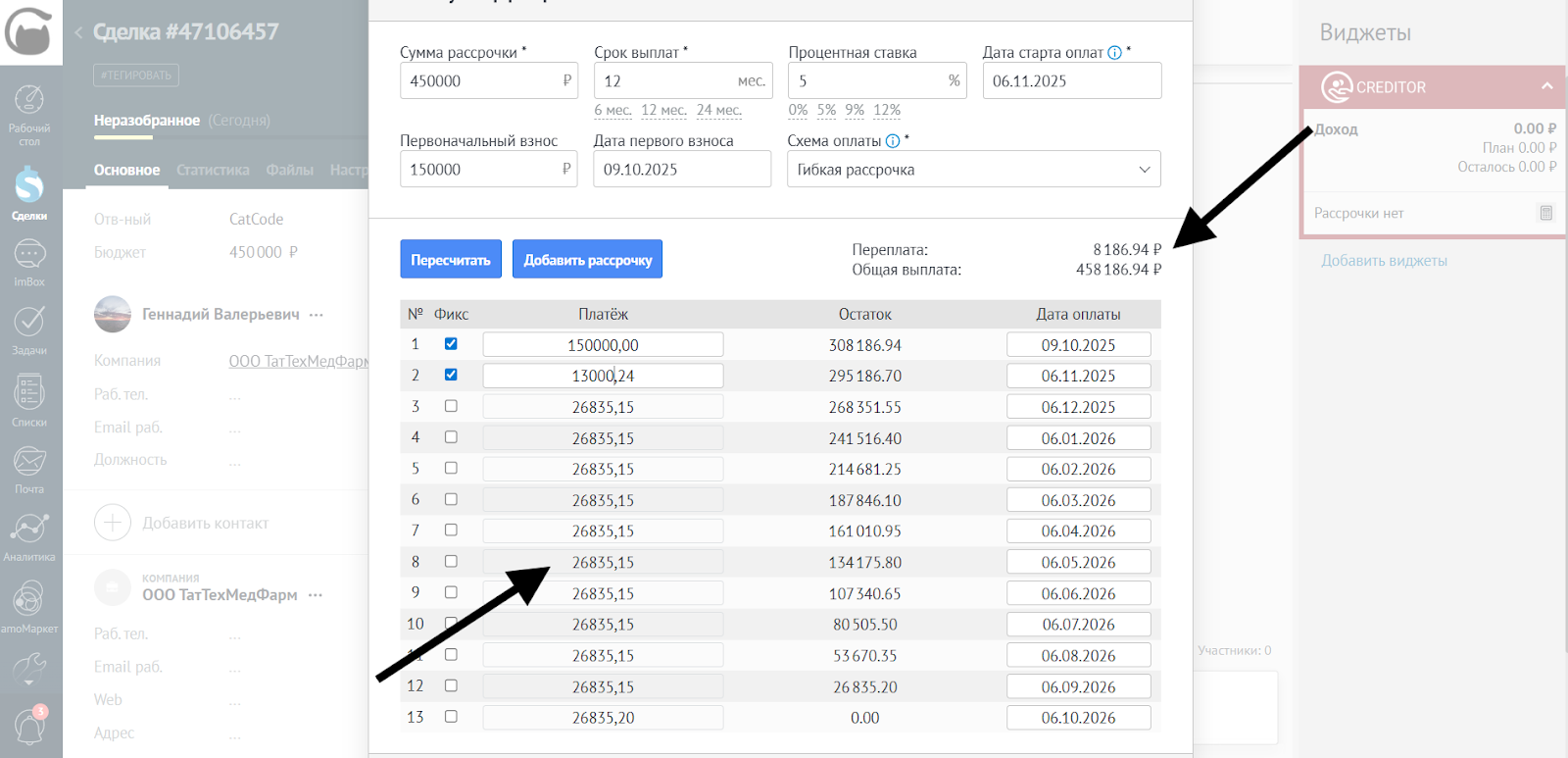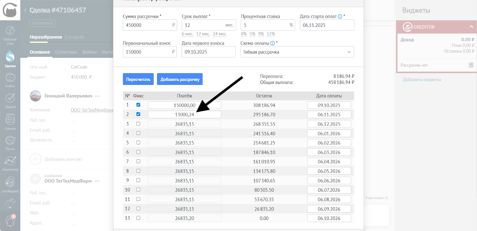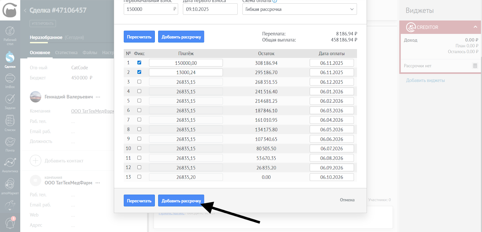 - После редактирования сумм и дат убедитесь, что все платежи корректны. Нажмите Добавить рассрочку, чтобы применить изменения в сделке:
