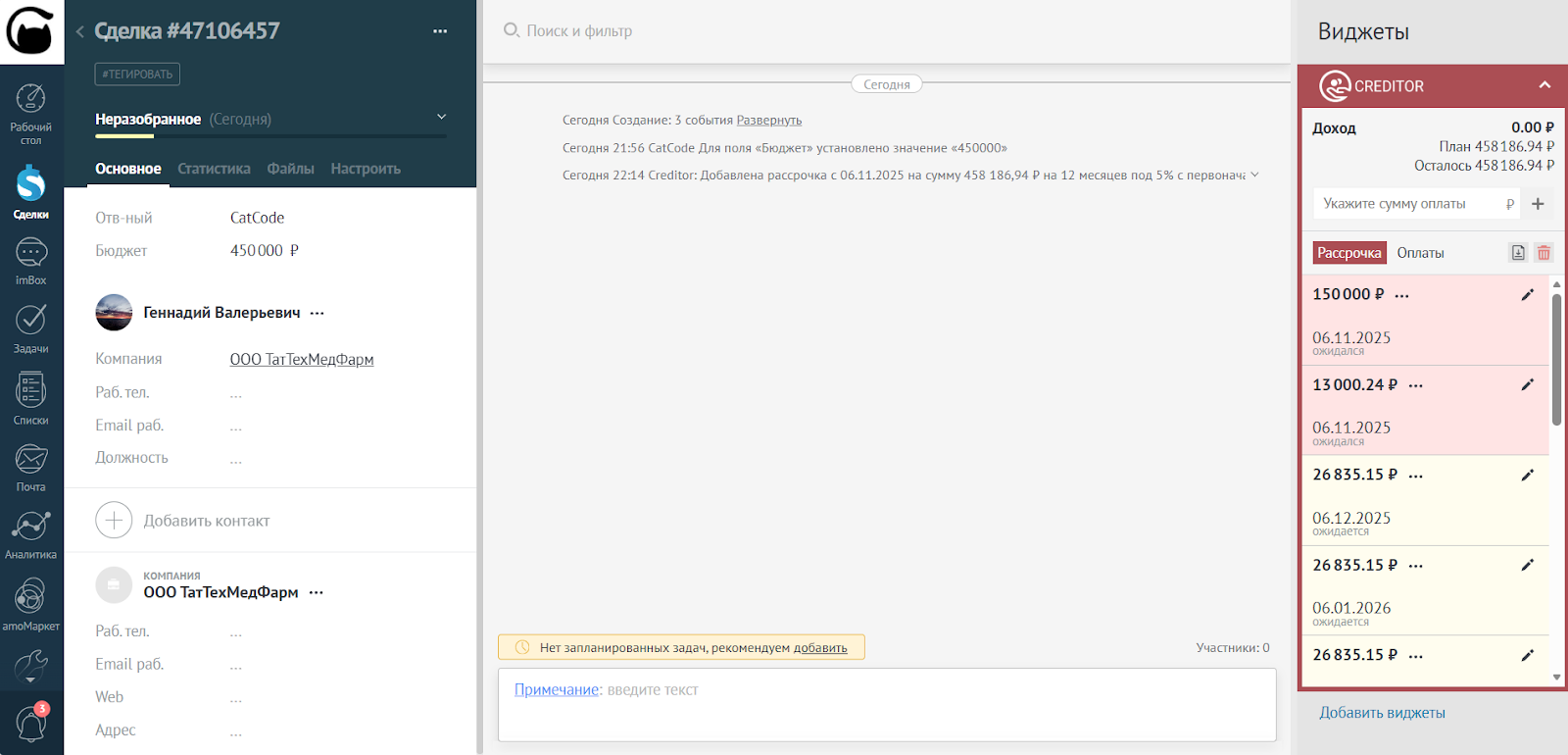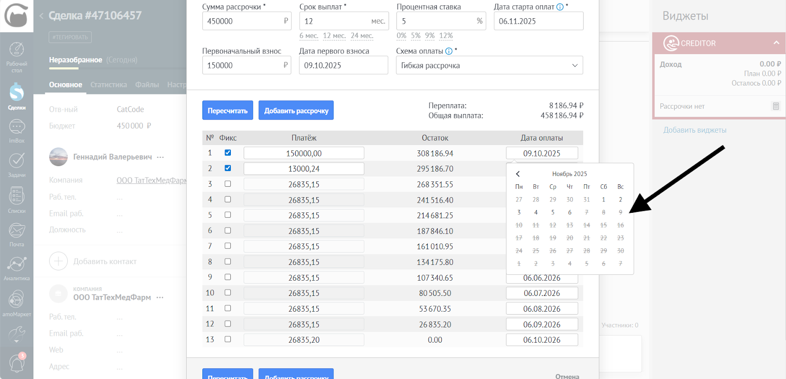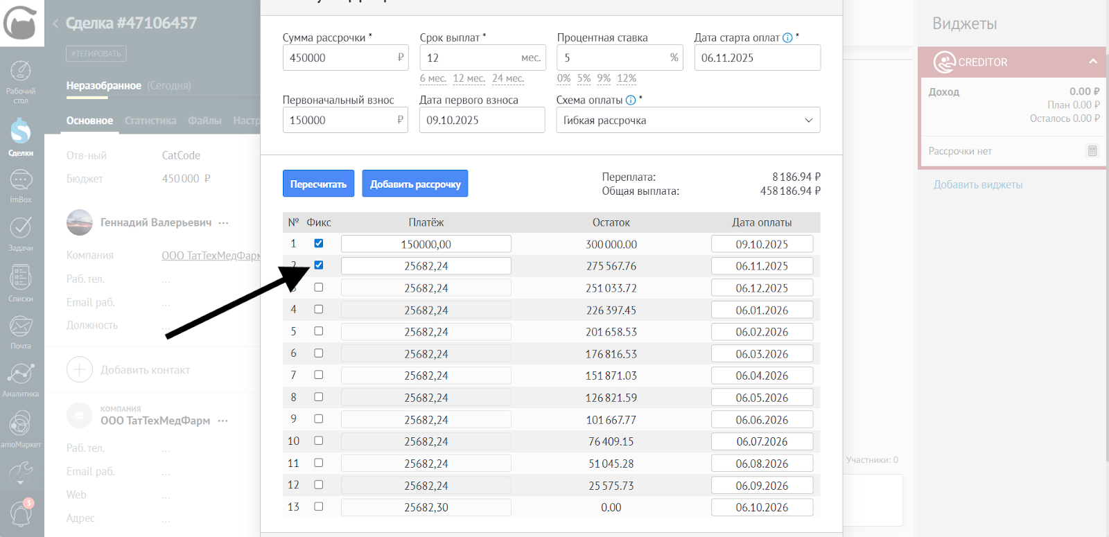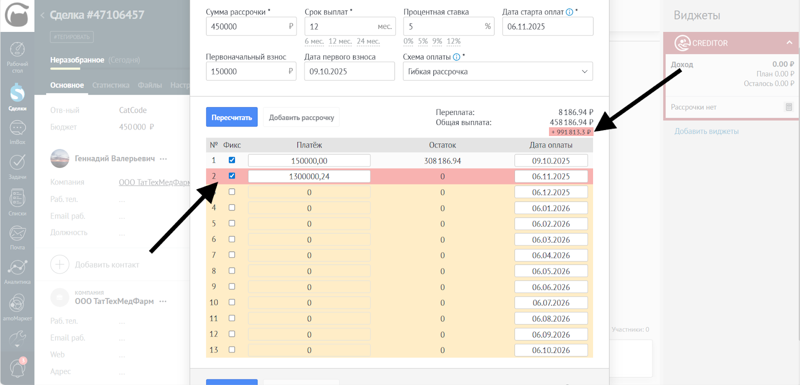 - После редактирования сумм и дат убедитесь, что все платежи корректны. Нажмите Добавить рассрочку, чтобы применить изменения в сделке: