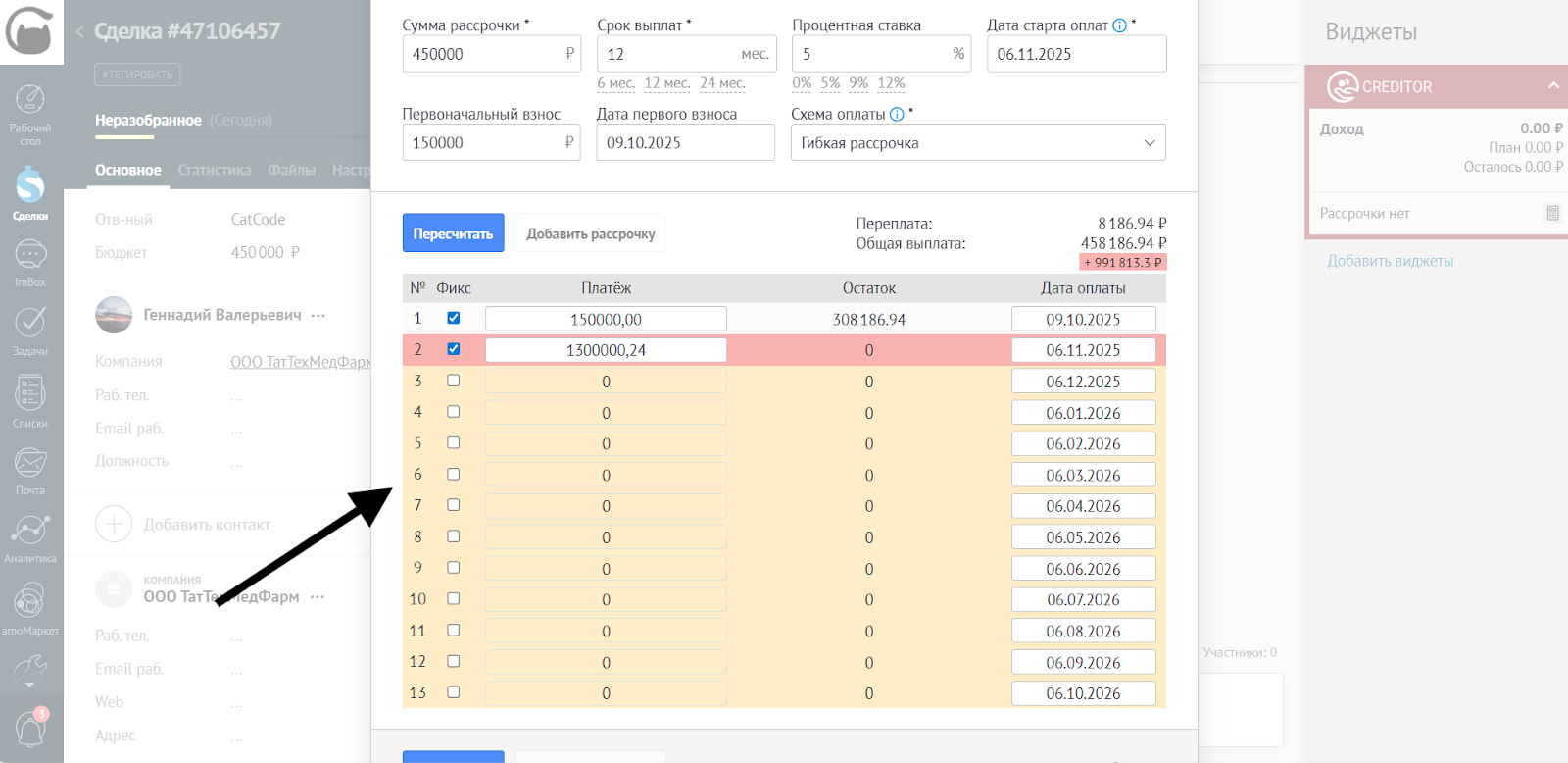 - Если в результате пересчётов платёж становится равным 0, строка подсветится цветом. Такие платежи не будут учтены при добавлении рассрочки: