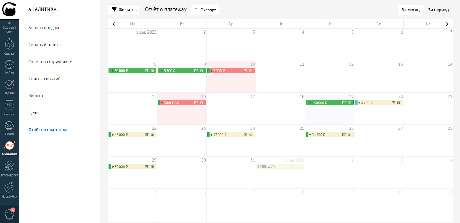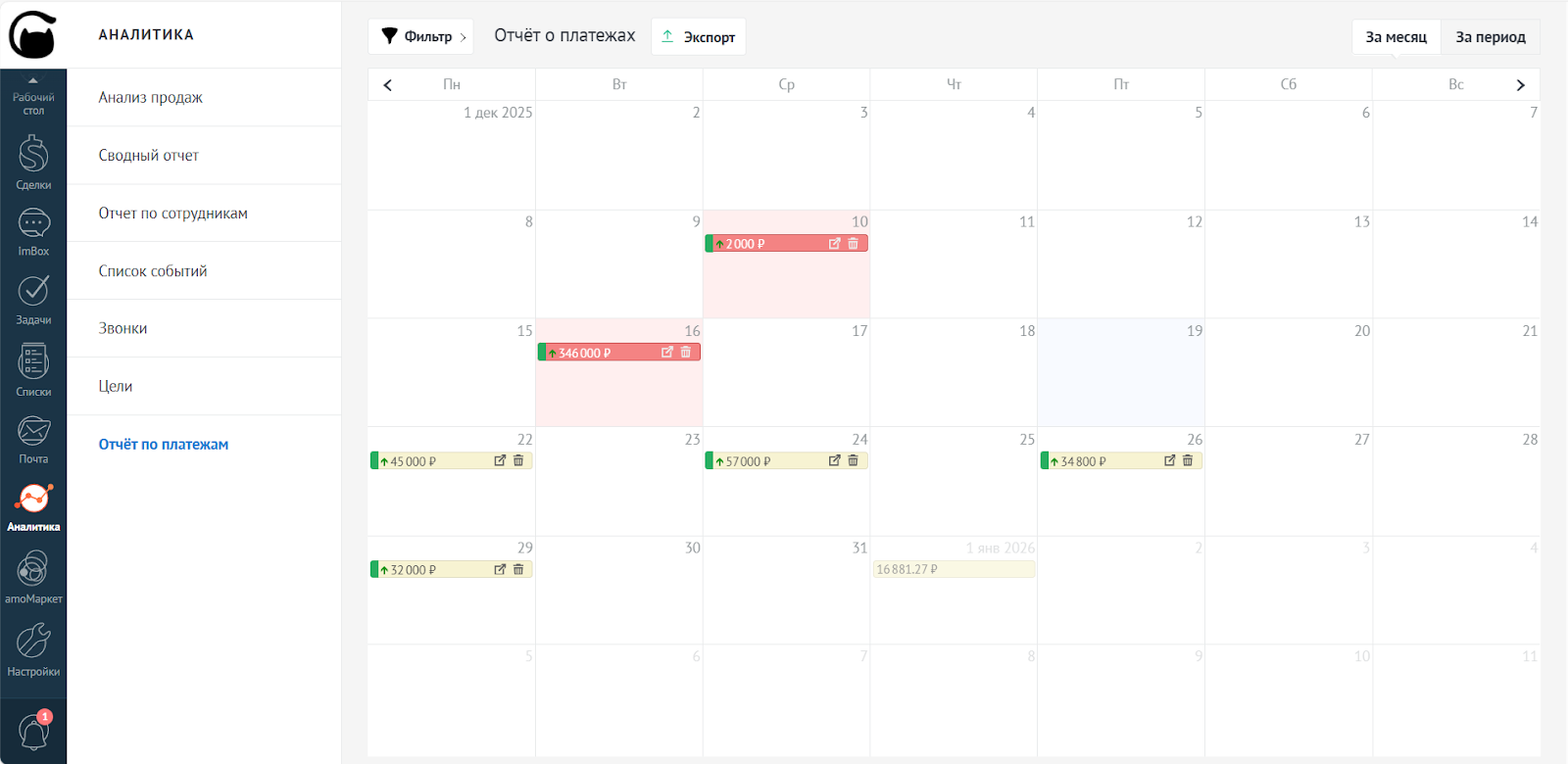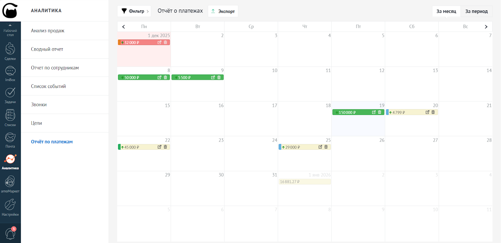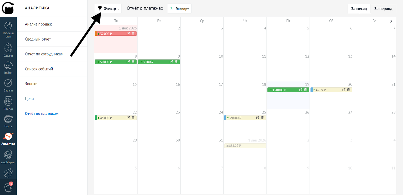 В календаре платежей вы можете отфильтровать данные: