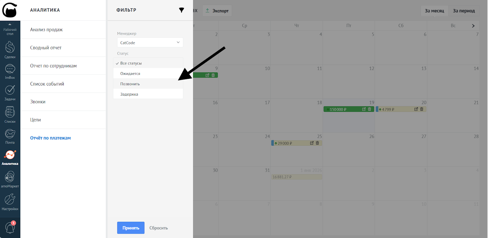 - Нажмите «Принять» — в календаре платежей отобразятся только сделки выбранного менеджера: